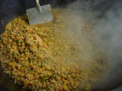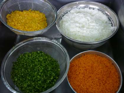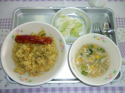 今日の献立の「メキシカンライス」は、お米と一緒にバター・カレー粉・パプリカ・塩を炊き込み、風味の良いご飯に挽き肉・玉ねぎ・にんじん・ピーマン・黄ピーマンを炒め、調味料で味をつけた具を混ぜ合わせて作りました。