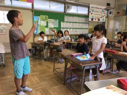 国語の学習では、スイミーの文章をもとに、お話クイズを作りました。文章の一部を他の言葉に変えて読み、間違っているところを当てるクイズです。友達の発表をじっくり聞き、たくさん発言がありました。