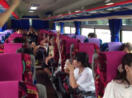 高速道路を走るバスの中では、バスレクで盛り上がっています。