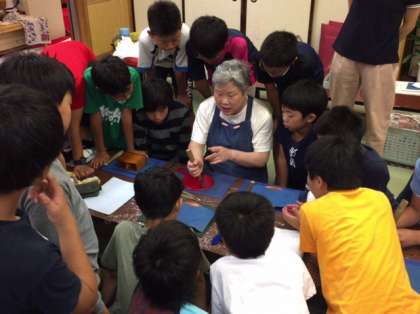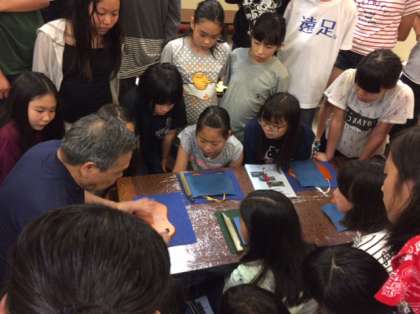 いよいよ、日光彫をします。ここでも、ガイドの子供二人が日光彫の歴史などを詳しく話しました。メモを見ないで堂々と話しました。