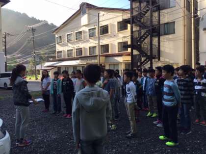 気持ちのいい朝を迎えました。宿の前で朝会をしました。昨日は、少し寝不足気味の子が多いようです。