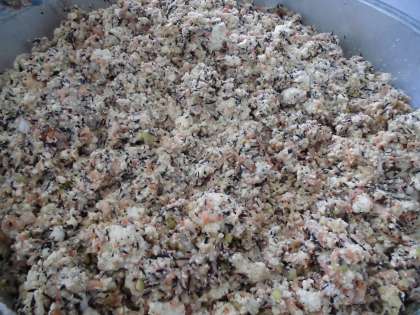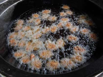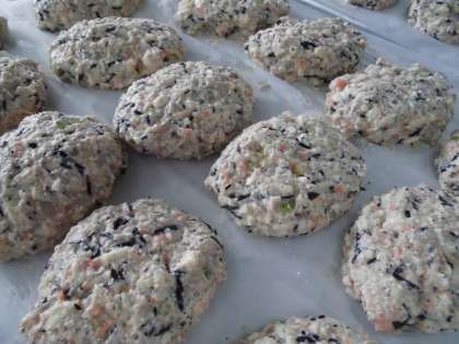 真砂(まさご)とは、細かい砂という意味です。具材を細かく刻んで作ります。絞りとうふ、細かく刻んだむきえび、鶏ひき肉、ちりめんじゃこ、ながねぎ、にんじん、ひじき、調味料を合わせてよく混ぜます。低学年・中学年・高学年の量に分け、小判型に作ります。油でカラッと揚げます。