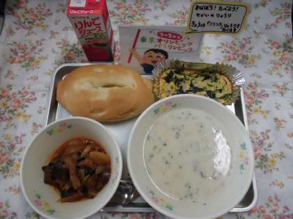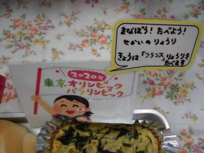 26日の給食は「学ぼう!食べよう!世界の料理〜フランス」です。フランスでは1900年に第2回、1924年に第8回のオリンピックが行われました。第8回大会からは「マイク」が導入され、それまでは「メガホン」を使っていたそうです。歓声でかき消され、選手や係員に指示が行き届かないこともあったようです。また、選手村が設置されたのもこの大会からだそうです。給食ではフランス料理を作りました。ラタトゥイユは水を一滴も入れない野菜の旨みが詰まった料理です。ズッキーニ、なすをたっぷり使いました。「なす」は苦い、辛いなどの特徴はありませんが苦手とする子が多い野菜です。これから旬をむかえますので、ぜひ残さず食べてほしい食材です。