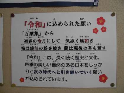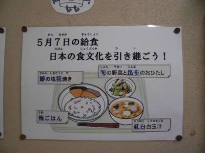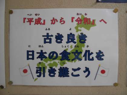 5月1日に年号が「平成」から「令和」へ変わりました。「令和」には長く続く歴史と文化、四季の美しい自然のある日本をしっかりと次の時代へと引き継いでいく願いが込められています。そこで給食では5月7日(火)に「令和お祝い献立」を作りました。