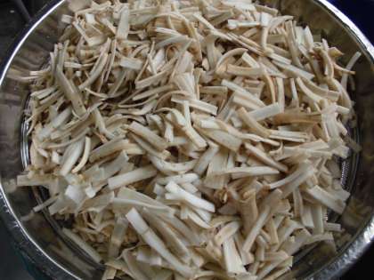 大豆をカラッと揚げたら、続いてごぼうです。ごぼうは短冊切りにしておきます。