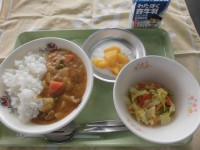 26日の給食はチリビーンズサンド、野菜のスープ煮、ヨーグルトポムポム、牛乳です。コッペパンに、はさむ具に使う豆は「金時豆」です。乾燥金時豆をやわらかくコトコト茹でました。量的には少なめですが、パンをよりおいしくし、豆もおいしく食べることができる献立です。この日の地元野菜はチリビーンズサンドの具の「にんじん」、野菜のスープ煮の「キャベツ」です。
