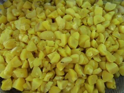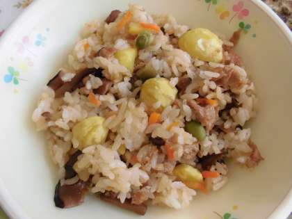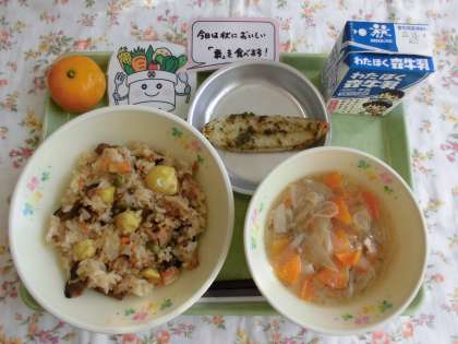 28日の給食は秋の彩ごはん、笹かまぼこのマヨネーズ焼き、根菜ごま汁、果物(冷凍みかん)、牛乳です。秋の彩ごはんには国産の生むき栗をたっぷり使いました。栗だけを別に甘く煮て、具に加えたため、色鮮やかなごはんとなりました。にんじんのオレンジ、枝豆の緑も鮮やかさに磨きをかけています。
