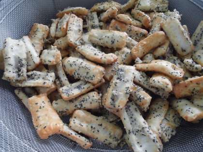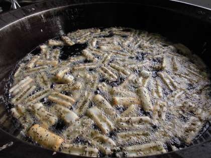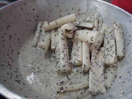 八王子城には敵からの攻撃を防ぐために石垣がありました。その石垣をイメージして給食で石垣揚げを作りました。衣に白ごま、黒ごまを入れます。1本のちくわを4つに切り、しっかり衣をつけ、油でカラッと揚げます。