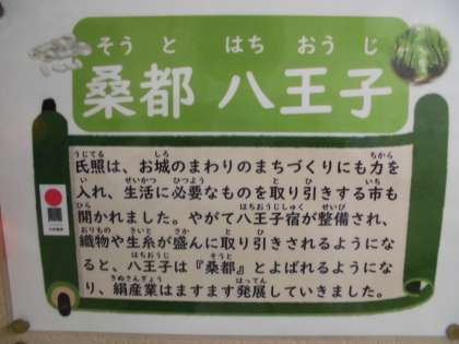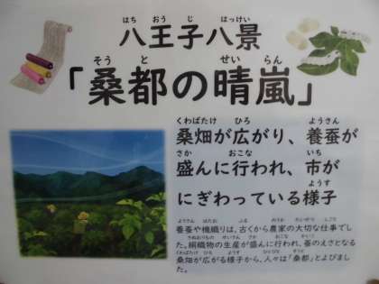 北条氏照が城下の景色の優れている土地の様子を歌に詠んだ「八王子八景」の一つに「桑都の晴嵐(せいらん)」があります。八王子は古くから絹織物の町として有名です。養蚕や機織りが農家の大切な仕事でした。生活に必要なものを取引する市(いち)も開かれ、旅や商売をするひとが泊まる八王子宿が整備され、絹織物の生産と取引が盛んにおこなわれました。そのことから蚕のえさとなる桑畑がたくさん増え、桑畑の広がっている様子から人々は八王子を桑の都、桑都と呼ぶようになりました。
