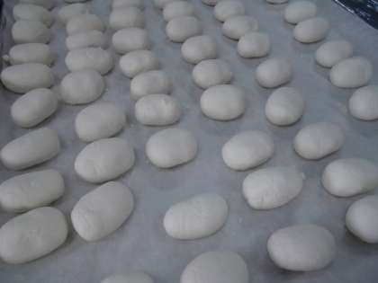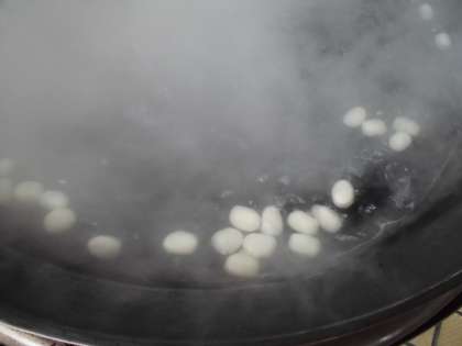 絹のお吸い物には白玉粉、絹豆腐、シルクパウダーで作った繭玉型白玉を入れました。白玉粉に豆腐とシルクパウダーを加え、一人2個の繭玉を一つずつ丁寧に作りました。大きな釜2つでしっかり茹でます。