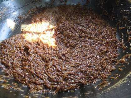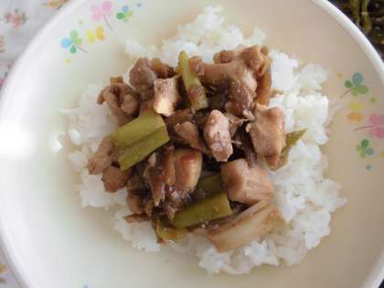 ねぎだけでは野菜が少ないので、ごぼうをささがきにして、タレで煮ておきます。その中にこんがり焼いた長ねぎ、鶏肉を入れて出来上がり。温かいごはんの上にのせていただきます。長ねぎが苦手な子もおいしく食べられるのではないかなと思います。