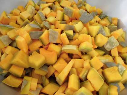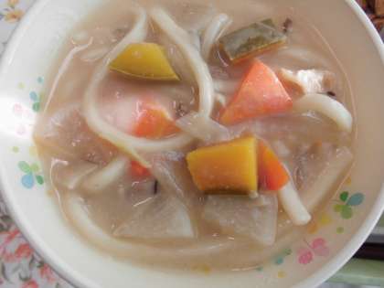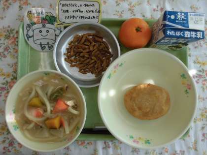 4日の給食はほうとううどん、じゃがもち、アーモンド黒糖、果物(みかん)、牛乳です。ほうとううどんには八王子産のかぼちゃを使いました。皮が白いことが特徴の「雪化粧」という品種です。みずみずしく、さっぱりとした味わいのかぼちゃでした。