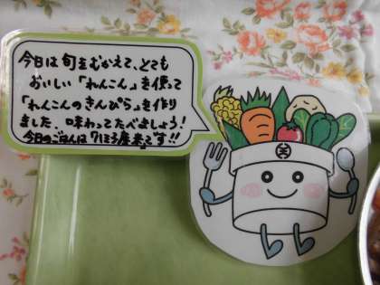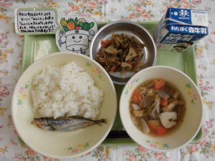 9日の給食はごはん、焼きししゃも、きりたんぽ汁、れんこんのきんぴら、牛乳です。この日のごはんは「八王子で作られたお米」です。今年は豊作で4回使用することができました。とてもツヤがあり、もちもちとした食感でおいしいお米でした。来年も食べられるといいですね。
