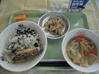調理員さんが、乾燥大豆を今日の朝、水で戻し柔ら