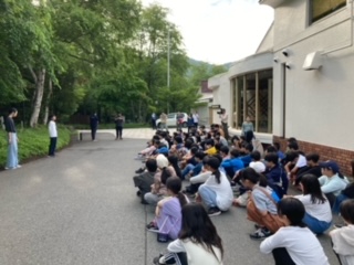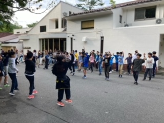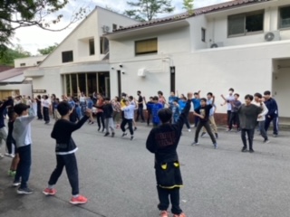 青空のもと、朝会をしてぼくらの八王子で体のウォーミングアップです。