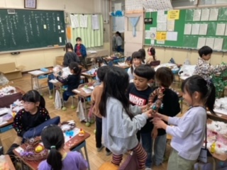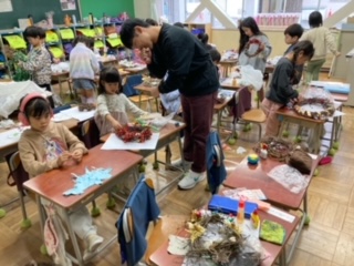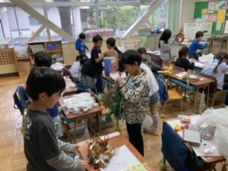 1年図画工作科「リースを作ろう」朝顔のつるを使って、リース作りをしました。飾りを工夫して素敵な作品ができそうです。