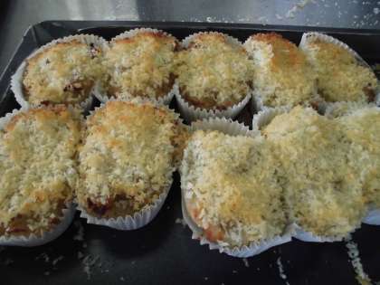 調味料で味つけし、カップに入れパン粉とオリーブ油を合わ
