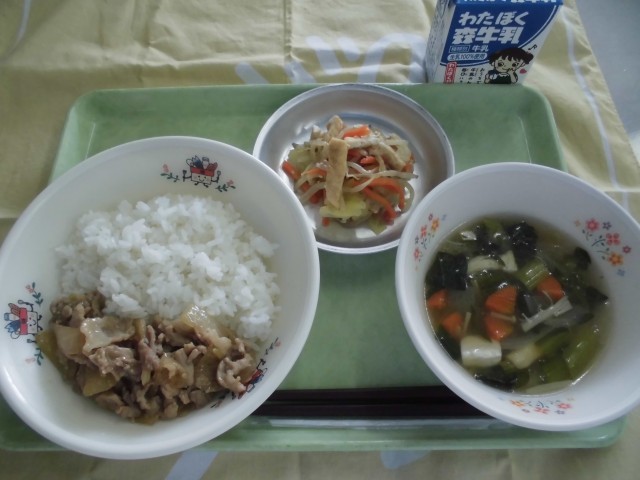 ☆今日の給食☆*ごはん*豚肉のしょうが焼き*野菜と油揚げのごまあえ*小松菜汁*牛...