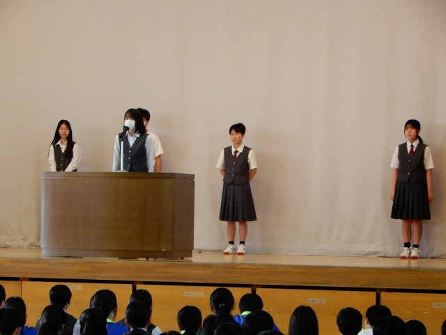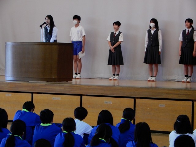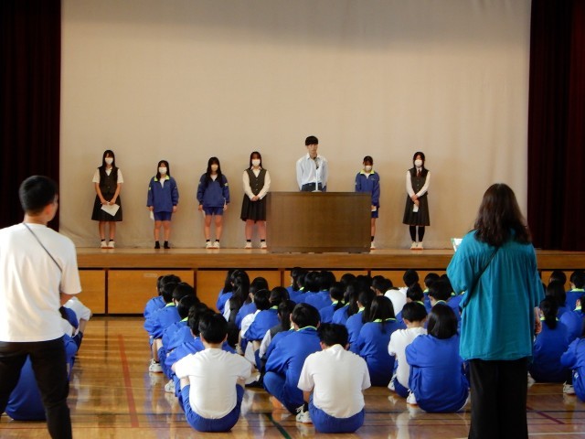 生徒会役員からは、1年前の役員選挙からこれまでの活動を振り返り、全校レクという新しい取組に挑戦できたことの達成感や協力してくれた全校生徒への感謝が述べられました。