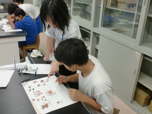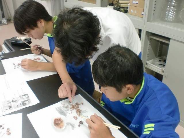 割りばしやピンセットを用いて丁寧に取り出し、構造や大きさなどを調べていきます。