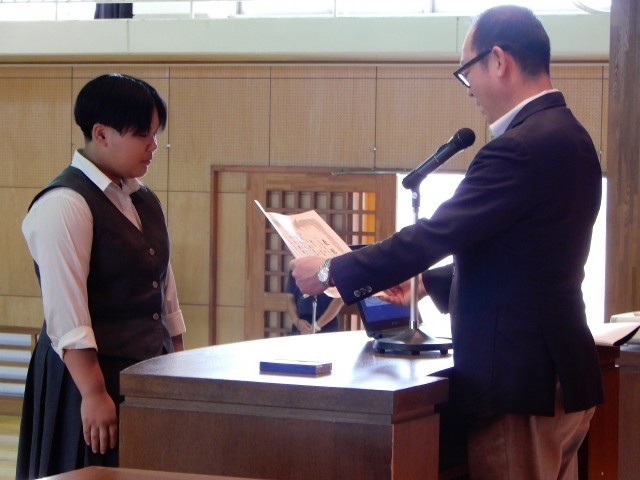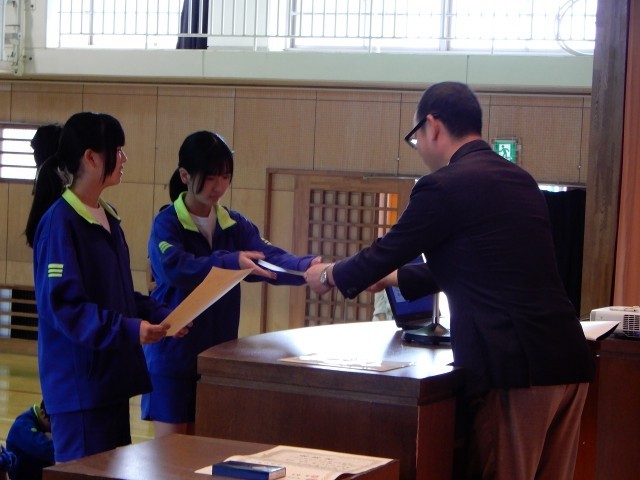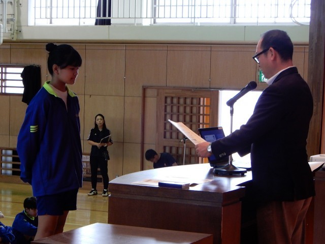 陸上、ソフトテニス、バドミントン、柔道の表彰を行いました。