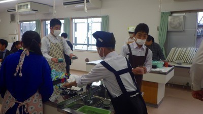 「いらっしゃいませ」と出迎える係、キッチン担当、注文を受ける係、お冷を出す係、メニューを渡す係など役割分担をして取り組みました。