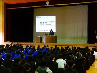 校長講話は「流れ星は願いごとをかなえてくれるのか」という内容です。