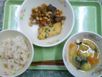 ★今日の献立八王子しょうがごはんいかの香り焼き五目煮豆さつまいもの味噌汁牛乳