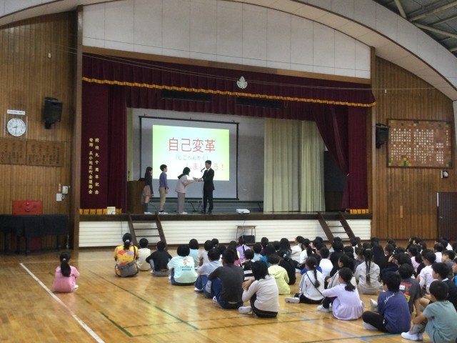 全校朝会では、その努力がたたえられ、各クラスの代表児童が賞状と優良校に送られる記念品を受け取りました。