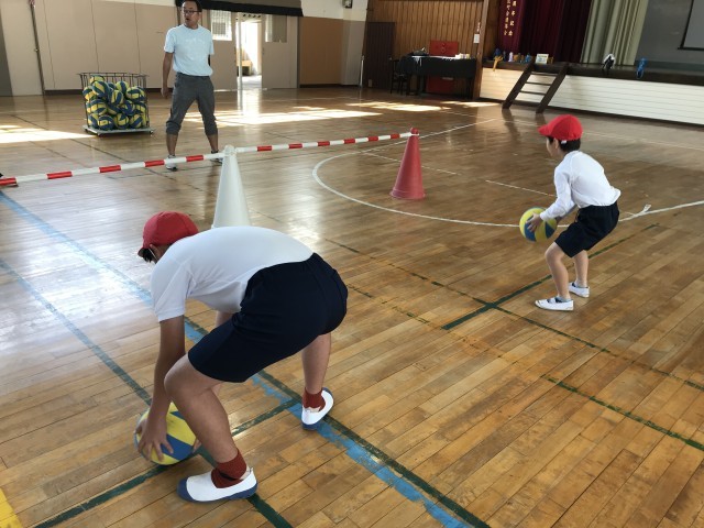 今回は、ボール運動に取り組みました。コーンとバーを挟んで友達と向き合い、ボールを転がしてキャッチしたり、自分側でバウンドさせてから相手のコートへボールがいくように投げたり、相手から投げられたボールをキャッチしたりしました。自分が投げたボールを相手がキャッチできたら得点としたゲームでは、相手が取りやすいように考えて投げるなどの姿が見られました。