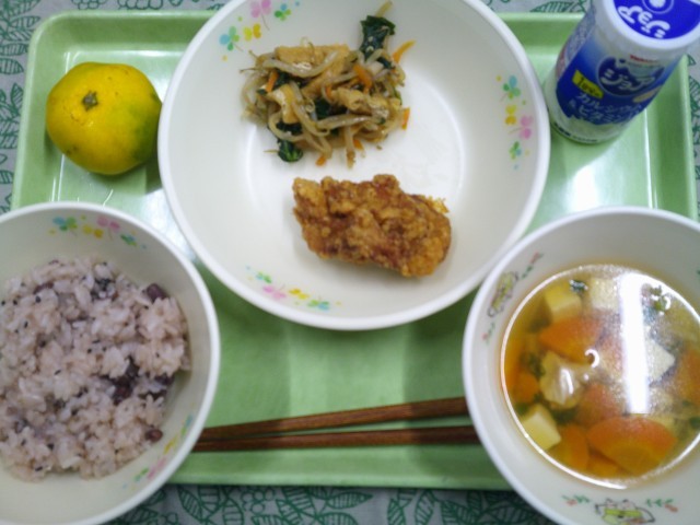 子どもたちの好きな「からあげ」には、色とりどりの和え物をそえています。