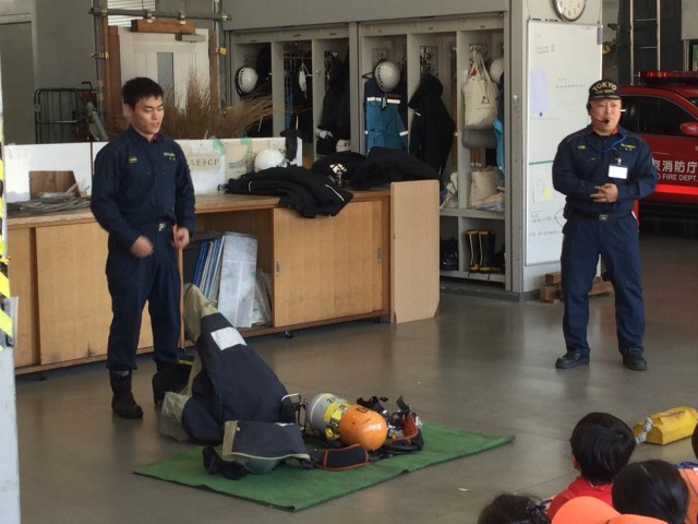 防火服への着替えも実際に見せていただきました。その後、井上先生も着させてもらいました。(3枚目)動けないくらい重かったそうです。それを身に付けて現場に駆け付ける消防士さんのすごさを感じることができました。