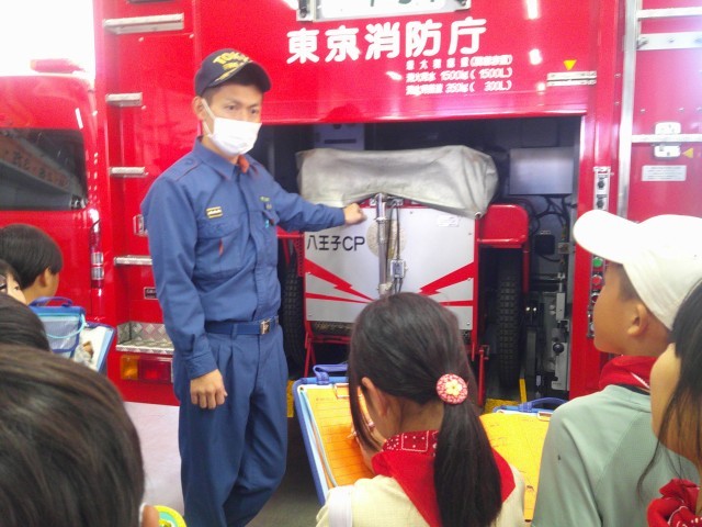 ガレージの中を自由に見学させてもらいました。ポンプ車やはしご車を間近に見学したり、消防士さんに話しかけて質問したりしながら、仕事の道具や気を付けていることなどについてたくさん学ぶことができました。
