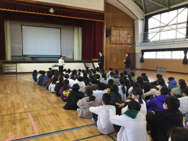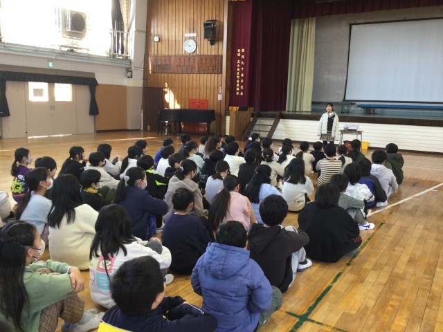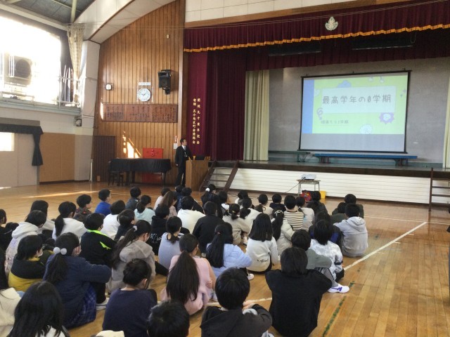学年集会では、各クラスの代表児童が冬休みの思い出を発表し、真剣に耳を傾ける姿が見られました。