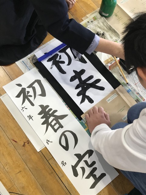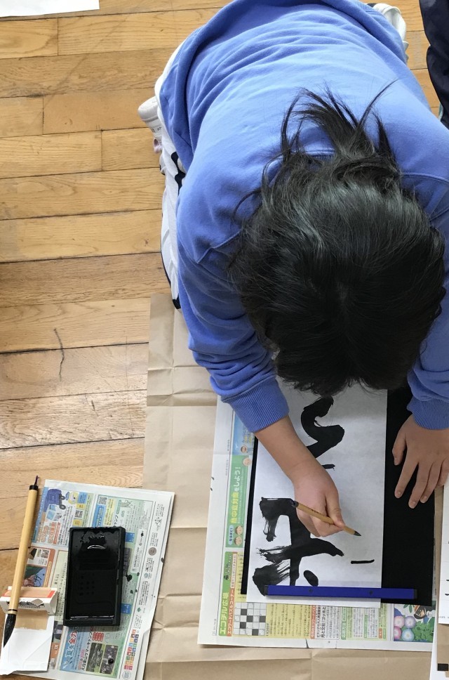 交流学年と一緒に書初めを行いました。4・5・6年生は慣れない毛筆ですが、お手本をよく見て一画ずつ丁寧に書きました。