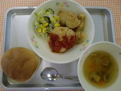 5月29日(火)の献立 公開日 2012/06/07 更新日 2012/06/05 給食の献立 <今日の給食> セルフサンド(ハンバーグ)、アーモンドポテト、キャベツとだいこんのサラダ、きのこスープ、ぎゅうにゅう いいね(0)