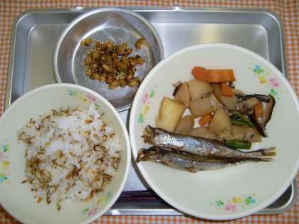 じゃこナッツごはん、やきししゃも、こんさいに、だいずのあげに、ぎゅうにゅう