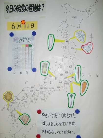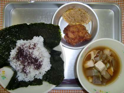 6月11日(月)の献立 公開日 2012/06/15 更新日 2012/06/15 給食の献立 <今日の給食> セルフおにぎり、えのきのつくだに、とりのからあげ、けんちんじる、ぎゅうにゅう いいね(0)