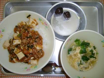 マーボーどん、レタスとたまごのスープ、たまこんのいために、ぎゅうにゅう