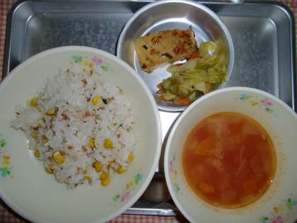 6月15日(金)の献立 公開日 2012/07/24 更新日 2012/07/24 給食の献立 <今日の給食> コーンピラフ、ミネストローネスープ、イカのハーブやき、キャベツのソテー、ぎゅうにゅう いいね(0)