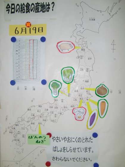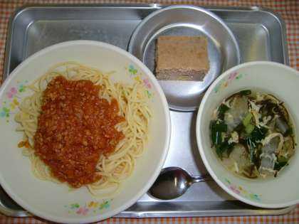 スパゲティミートソース、もずくスープ、ミニあじさいケーキ、ぎゅうにゅう