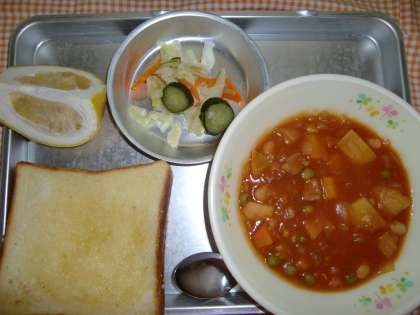 7月5日(木)の献立 公開日 2012/07/24 更新日 2012/07/24 給食の献立 <今日の給食> はちみつレモントースト、いんげんまめのシチュー、やさいのピクルス、くだもの、ぎゅうにゅう いいね(0)