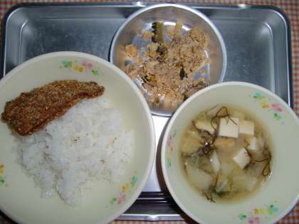 <今日の給食> ごはん、あじのゴマフライ、もずくのみそしる、ゴーやチャンプルー、ぎゅうにゅう