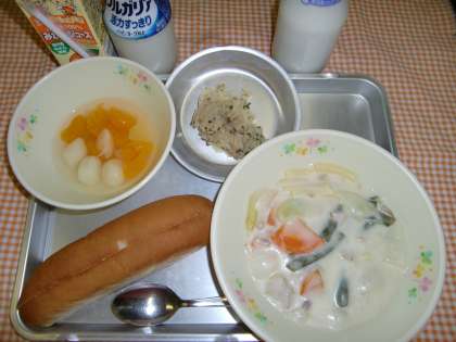 7月17日(月)の献立 公開日 2012/07/24 更新日 2012/07/24 給食の献立 <今日の給食> セルフサンド(ツナポテト)、パスタシチュー、しらたまポンチ、のみものセレクト 飲み物は、牛乳、オレンジジュース、のむヨーグルトの中から選びました。 いいね(0)