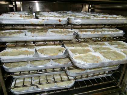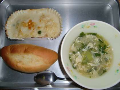 ソフトフランスパン、ポテトグラタン、グリーンスープ、ぎゅうにゅう