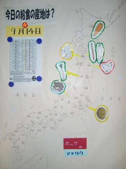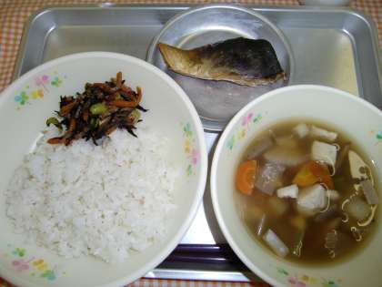 むぎごはん、やきざかな、ひじきのいために、けんちんじる、ぎゅうにゅう
