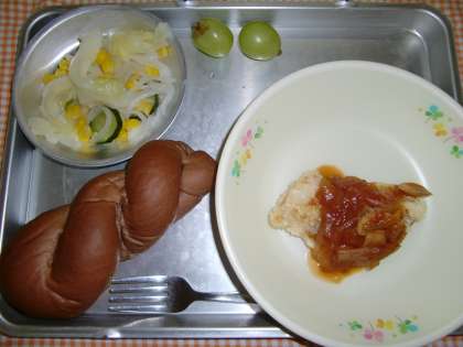 ココアパン、しろみざかなのトマトソースかけ、キャベツとだいこんのサラダ、くだもの、ぎゅうにゅう