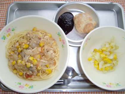 スープスパゲティ、コールスローサラダ、スコーン、ぎゅうにゅう