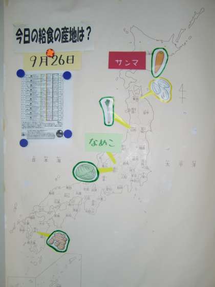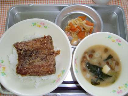 さんまかばやきどん、キャベツのピリカラづけ、なめこみそしる、ぎゅうにゅう