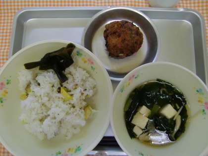 くりごはん、とうふのまさごあげ、きのこじる、こんぶのにもの、ぎゅうにゅう